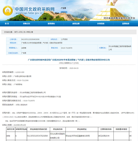 廣宗縣2020年冬季清潔取暖(氣代煤)設(shè)備采購安裝項目中標(biāo)