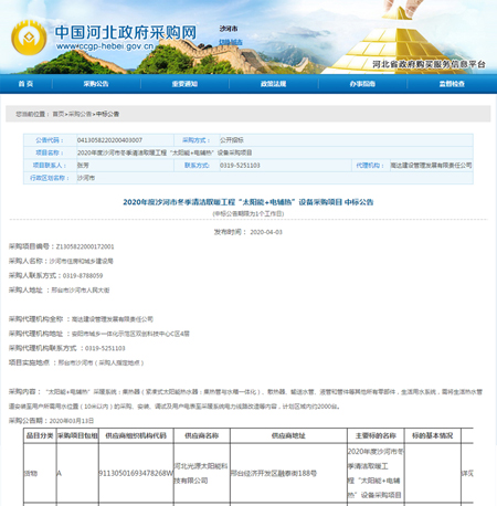2020年度沙河市“太陽能+電輔熱”設(shè)備采購項目中標(biāo)