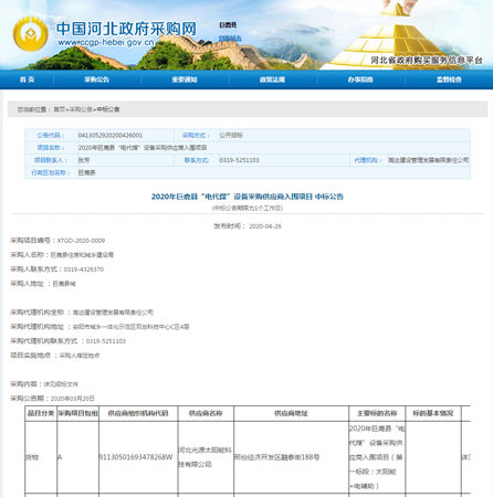 2020年巨鹿縣“電代煤”設備采購供應商入圍項目