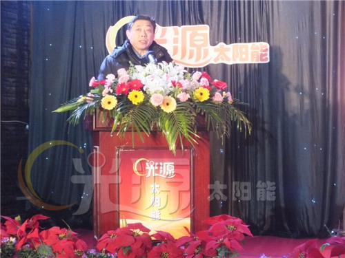首先,12月6日上午9:30,光源年會隆重開幕。在年會上,中國太陽能熱利用產(chǎn)業(yè)聯(lián)盟副理事長、中國太陽能熱利用產(chǎn)業(yè)協(xié)會副理事長、河北光源太陽能科技有限公司董事長李成彬致辭。他代表光源公司對各位領(lǐng)導(dǎo)、專家、經(jīng)銷商朋友的到來表示熱烈歡迎和衷心感謝,對光源2014年取得的成績和2015年發(fā)展方向進行了總結(jié)和展望。李成彬指出,2014年是光源發(fā)展史上不平凡的一年,在國內(nèi)經(jīng)濟增速放緩的大背景下,太陽能光熱行業(yè)也受到極大影響。但光源勇敢拼搏、堅定信念,以市場為導(dǎo)向,以銷售為龍頭,產(chǎn)量雖然相比去年有所下滑,然而,我們依然對太陽能光熱行業(yè)的發(fā)展前景充滿信心,相信太陽能光熱的春天一定還會到來。行業(yè)領(lǐng)導(dǎo)羅振濤、霍志臣、張曉黎、賈鐵鷹、楊桂元先后講話。在講話中,領(lǐng)導(dǎo)們肯定了光源跨越發(fā)展、科技創(chuàng)新取得的喜人成績,肯定了光源在全國同行業(yè)中的地位和作用,對光源未來發(fā)展提出了指導(dǎo)性意見。光源公司總經(jīng)理劉迎波在講話中詳細分析了光源公司面對的市場形勢,他說,光源公司在今后的發(fā)展道路上要審時度勢,及時調(diào)整經(jīng)營戰(zhàn)略和營銷政策,做精做細終端市場,和廣大經(jīng)銷商一起,打造符合光源特點的企業(yè)發(fā)展之路。