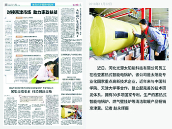 2018年11月22日,河北日?qǐng)?bào)刊登河北光源太陽(yáng)能科技有限公司生產(chǎn)蓄熱式智能電鍋爐的圖片新聞。