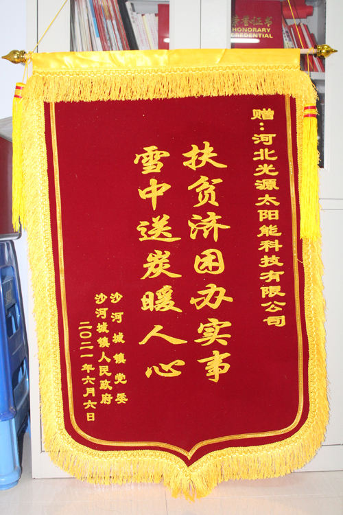 送人鮮花 留有余香 今天光源送給農(nóng)民壁掛爐,鎮(zhèn)黨委政府送來錦旗。錦旗上褒揚光源的14個大字就是余香:“扶貧濟困辦實事,雪中送碳暖人心”。這余香是鼓勵也是激勵,是褒揚也有希望。它鼓勵光源人要多做雪中送碳的人,激勵光源人多做扶貧濟困的事兒。光源人不會辜負這面錦旗。