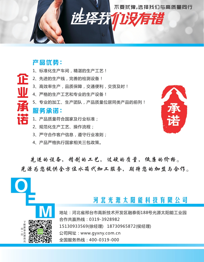 河北光源太陽能科技有限公司是一家集太陽能光熱產(chǎn)品研發(fā)、生產(chǎn)、銷售為一體的專業(yè)化骨干企業(yè)。公司地址位于河北省邢臺經(jīng)濟開發(fā)區(qū),總占地150畝,建筑面積5.2萬平方米,現(xiàn)有員工420人。主導產(chǎn)品:一是太陽能真空集熱管;二是家用型太陽能熱水器;三是集中式中高溫太陽能工程的設(shè)計、生產(chǎn)與施工。企業(yè)規(guī)模為河北省太陽能熱利用行業(yè)榜首,國內(nèi)業(yè)界名列前茅。