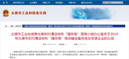 根據(jù)太原市工業(yè)和信息化局農(nóng)村清潔供熱“煤改電”領(lǐng)導(dǎo)小組辦公室制定的《太原市農(nóng)村清潔供熱“煤改電”電采暖設(shè)備供貨及安裝企業(yè)潛在投標(biāo)入圍資格一般要求和技術(shù)標(biāo)準(zhǔn)》(試行),經(jīng)專家委員會(huì)評(píng)審,確定河北光源太陽能科技有限公司為2019年山西太原市“煤改電”采暖設(shè)備入圍企業(yè)。入圍產(chǎn)品為:蓄熱式電鍋爐、蓄熱式電暖器。