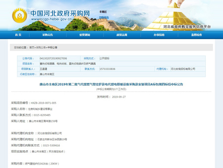 奮力拼搏創(chuàng)佳績,捷報(bào)頻傳奏凱歌。河北光源太陽能科技有限公司,在2019年09月27日,唐山市豐南區(qū)2019年第二批氣代煤燃?xì)獗趻鞝t及電代煤電取暖設(shè)備采購及安裝項(xiàng)目A標(biāo)包第四標(biāo)段中標(biāo),為我公司2019年度輝煌的經(jīng)營業(yè)績再添濃墨重彩的一筆。